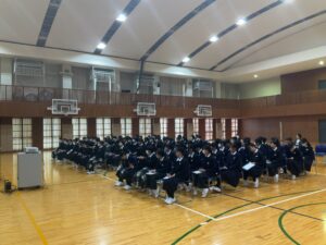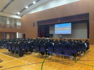 講話では、SNSの使い方や個人情報の取り扱い、ネット上のトラブルに巻き込まれないための注意点など、実例を交えながら分かりやすくお話ししてくださいました。生徒たちは真剣な表情で耳を傾け、日頃のインターネット利用について改めて考える良い機会となりました。