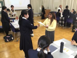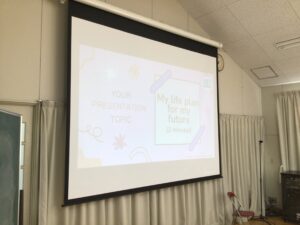中には小道具を作ったり、問いを投げかけたりと、より伝えやすくしようとする工夫がなされた発表もありました。普段口数が少ない生徒が大勢の人前で堂々と夢を語る姿や、聞き手と話し手が心がけるべきポイントを押さえながら行われるプレゼンに、教員の私はとても感動いたしました。詰まってしまっても、上手に話せなくなくても良い。頑張って伝えようとするだけで、他者の心には響くものです。Mistakes are OK. Mistakes are good!!