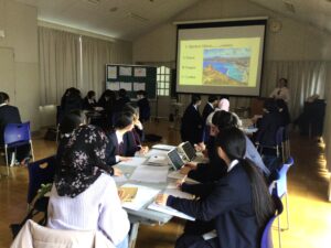 午前中は、グループリーダーとなる留学生の皆さんの出身国に関するクイズで盛り上がりました。行ったことのない国がほとんどの中、写真からイメージを膨らませて、日本とは異なる気候や風土に思いを馳せられたようですね。