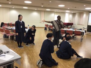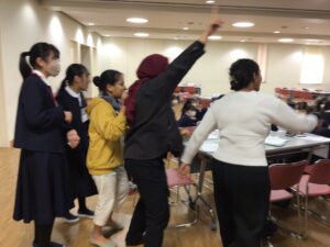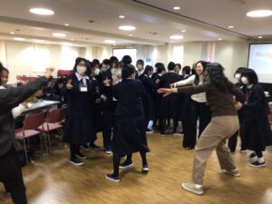 眠気を感じがちな午後からは、体を動かすアクティビティも。音楽に合わせて動きつつ、指定された人数の班を作っていくゲームで、積極的に声を掛け合うことができました。時には「班に1人は留学生を!」「班に1人はショートヘアの人を!」といった縛りをクリアできず、失格になってしまうこともありましたが、笑顔に溢れた楽しい時間になりました。