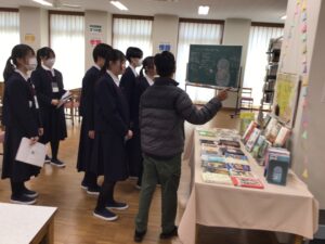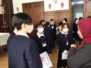 最後は校内ツアー。聖堂や図書室など、校内の各所をめぐり、紹介していました。いつもお馴染みの場所も、初めて訪れる人に紹介するとなると難しいものです。留学生からの英語の質問に英語で答えている姿も見られて、昨日からの成長が感じられました。