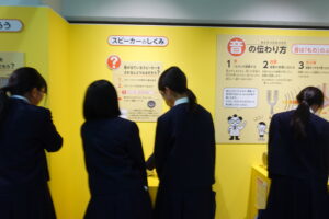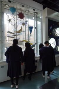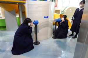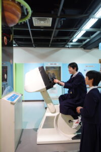 プラネタリウム鑑賞後には自由見学を実施し、光、電気と磁力、力と運動、音などさまざま装置で約1時間 ワ〜 キャ〜 ニコニコ ふ〜ん などなど、満喫する姿をたくさん見ることができました。1番人気は『ジョギング発電 宇宙へ飛び出そう!』 カロリーを消費したいお年頃でしょうか。次から次へとジョギング運動をしていました^_^